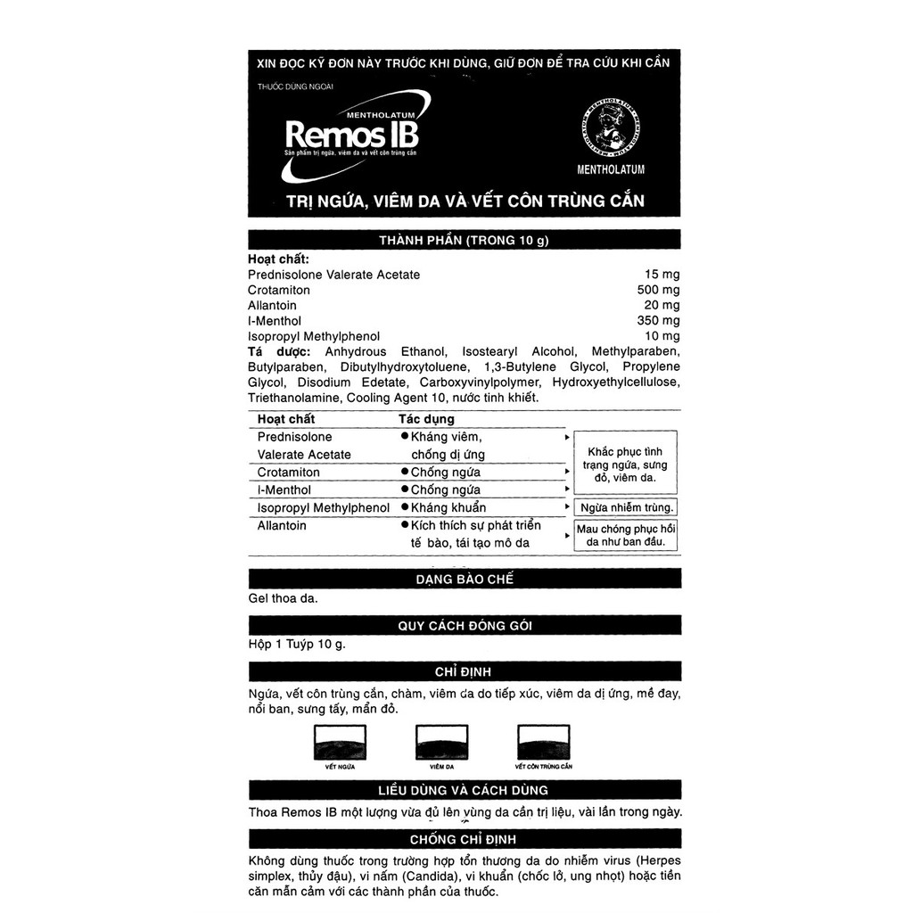 Remos ib mentholatum. - Mentholatum Remos IB sản phẩm Nhật Bản chuyên trị vết côn trùng cắn. Phòng 1808 Lầu 18 Saigon Trade Center 37 Tôn Đức Thắng PBến Nghé Q1 TPHồ Chí Minh. Công thức cải tiến Antedrug hoạt chất kháng viêm tác dụng tại chỗ không những nâng cao hiệu quả kháng viêm giảm ngứa và sưng tấy mà còn hạn chế tác dụng phụ so với các corticoid thông thường.