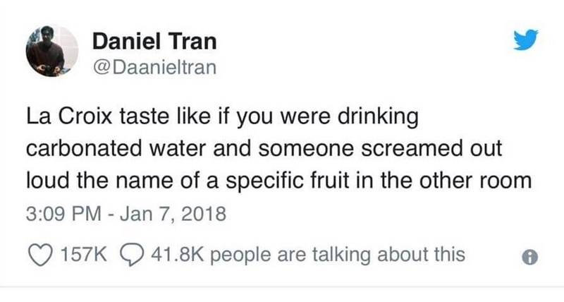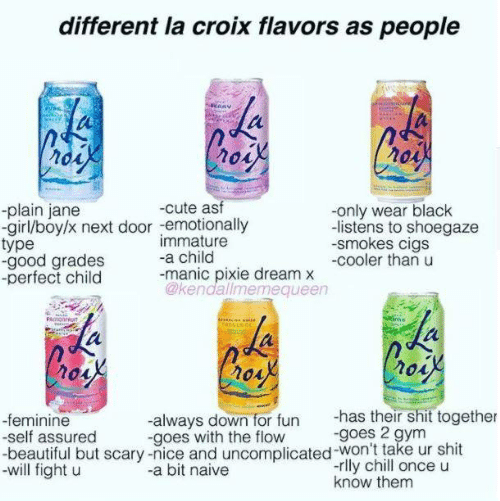 Lacroix tastes like meme. 12 Tweets That Will Trigger The Sht Out Of La Croix Fans. It tastes like if you put a lighter to it that itll just burn your house down. The cashier said strawberry perrier is amazing so Im trying that next.